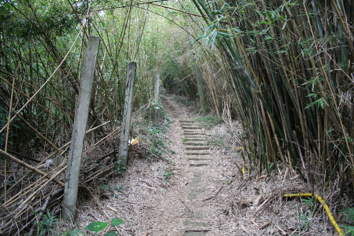 步道第三次穿越登山路。稍後的段落有些並沒有鋪上石階,走起來更舒服些。沿途有很多竹叢,形成頗為優美的隧道。H303m |