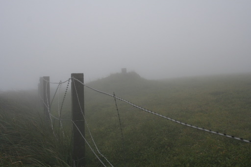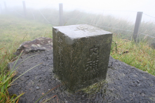 續行,首先從觀景台處循著助航台圍牆外側繞往三等點,距離約50公尺而已,有不明顯小徑。稍後即貼近助航台圍欄,種有海芋,花正盛開。可惜有狗狂吠,幸好霧中兩不相見,比較不那麼恐怖。在基石點位附近見到第一顆基石,助航單位所立,不是三等點。越過圍欄外的小土丘後即發現三等點。 |