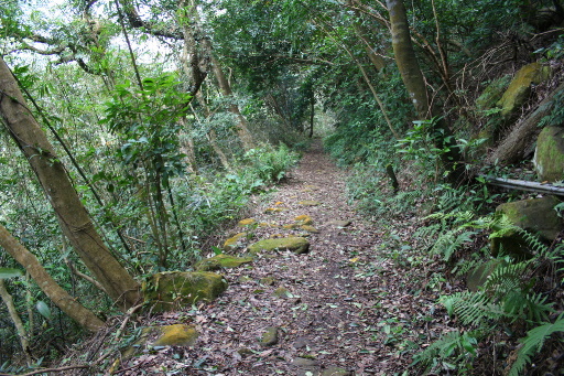 步道穿越半嶺產道。石階步道一路往上。稍後進入農墾區,轉為水泥小徑。H156m |