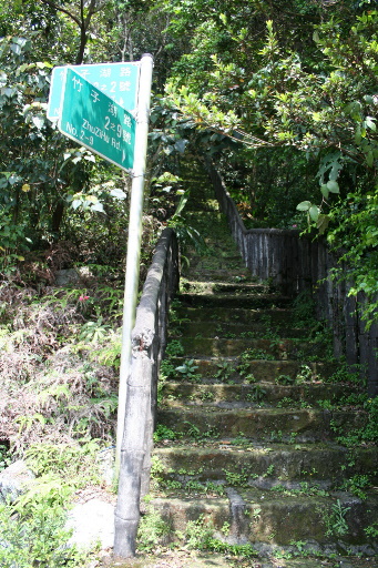 不明顯的步道叉路,取右穿越陽金公路,有條急陡上且長滿青苔的石階步道,指標往竹子湖路2之9號。這條步道真是又陡又滑,顯然很少人利用,小心行走。H630m |