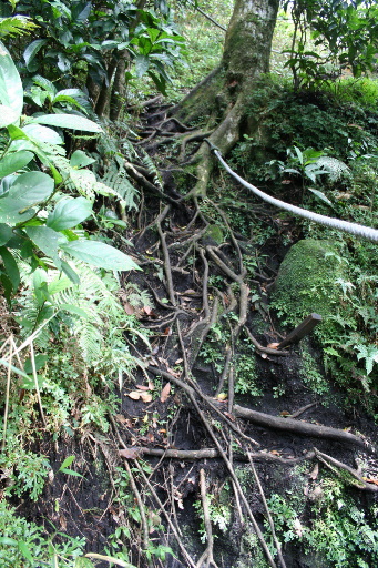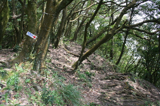 續行,廁所指標過後立刻取左往上。稍後即出現攀繩陡上,但難度不高。 |