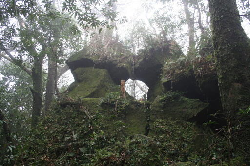 月形池,這應該是座古墓,但太過古老,看不出字跡。傳說則是凱達格蘭人的祭壇。從月形池隱約可見霧中小山,人稱凱達格蘭山,傳說則是金字塔。右側有路可繞往恐龍接吻石另一側,然後循原路出去。H1041m |