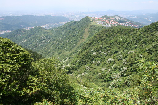 岩地,眺望大丘田山。俯瞰右側山谷,油桐花盛開,妝點得頗為繽紛。續行仍是大片芒草區。眺望安坑地區。H700m |