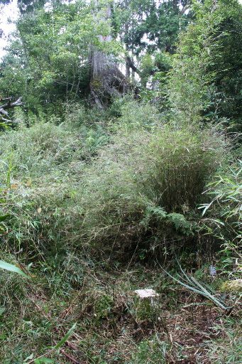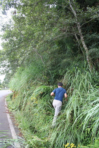 續行,從電線桿處退回約20公尺的擋土牆缺口自行砍路直上,剛開始是芒草區急陡上,但不長。上稜後趨緩,往右側緩上,鑽過大樹洞,發現有廢棄水管往山頂延伸。 |