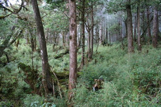 續行,這種狀況難不到小花,先行一步,稍後小花果然就出現了。山路大致上循稜而行,路上箭竹茂密,撥開可見路跡,要留意零星出現的路條。沿途多鐵杉,比鐵杉林步道更優美一些。前段大都在稜線左側繞行。 |