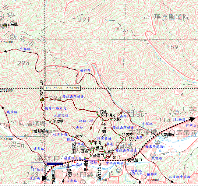 大茅埔山登山口,安康路三段147號紅頂民宅旁。休息整裝。距離安康路約20公尺。中央新城站,就是中央印製廠站的前一站。H55m |
