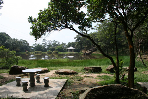 叉路,石階步道左轉下往夢湖,直行的保線路可登新山,取左遊湖再回,隨即到達夢湖東側涼亭。 |
