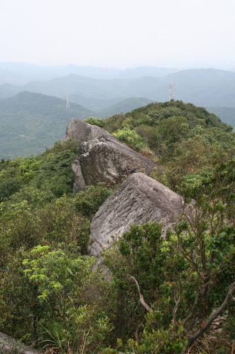 續行,稍退回,叉路取右上稜。東稜山路多大石,展望極佳,可眺望整個五指山列,還有友蚋七分寮山區。 |