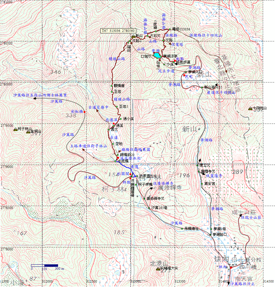 回到東側涼亭旁的叉路口,取左循保線路上新山,約0.8K。保線路寬大,蜿蜒向上。H294m |