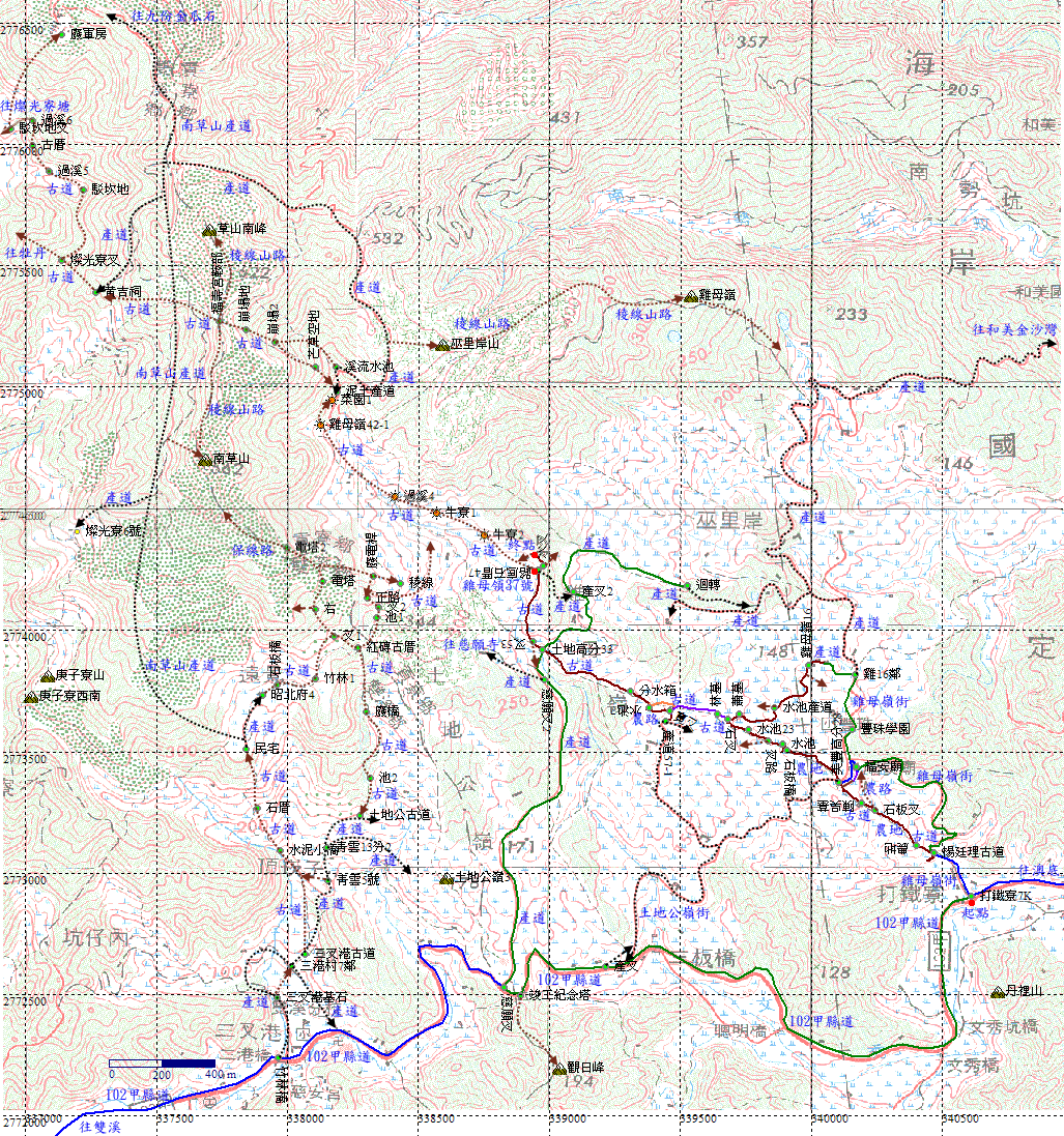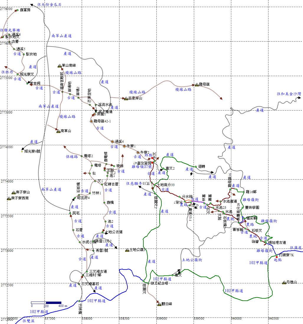 雞母嶺53號民宅旁,位於第二個慈願寺叉路不遠,停車。民宅旁的橋頭兩端發現古道入口。土地高分33。H235m |