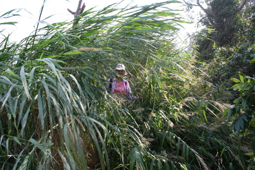 續行,往新埔之路雜草叢生,但路跡依稀可辨。稍後出現高大芒草叢,且路徑消失,橫衝而過,突然發現芒草被砍得乾乾淨淨,此後就一路好走。稍後遇地主,原來芒草是他砍的,他說過一陣子會把整條路都砍乾淨,附近農地將來要營造成生態農園。 |