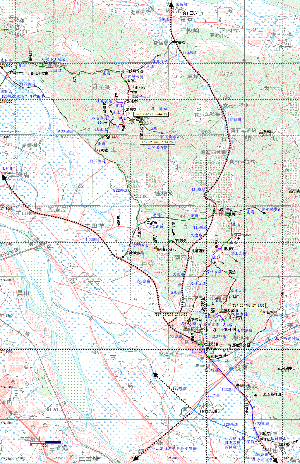 回到竹22鄉道,路口有座涼亭,左往芎林,右往竹北,直行,往120縣道搭車。遠眺石頭坑山。H56m |