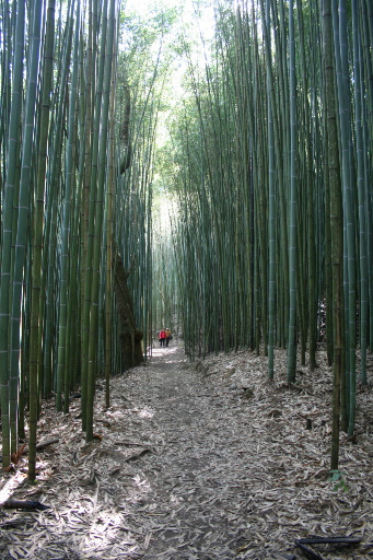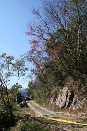 續行,此後古道路徑一路暢通,這裡停了幾輛原住民的機車。附近的竹林與楓香純林風景非常優美。 |