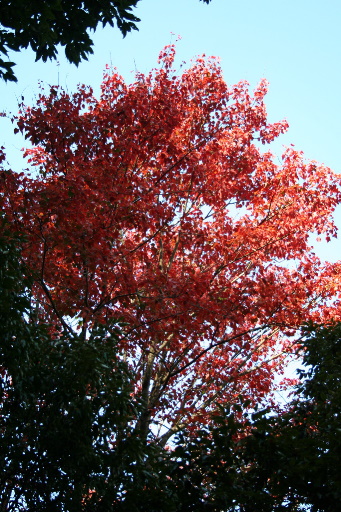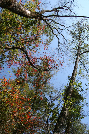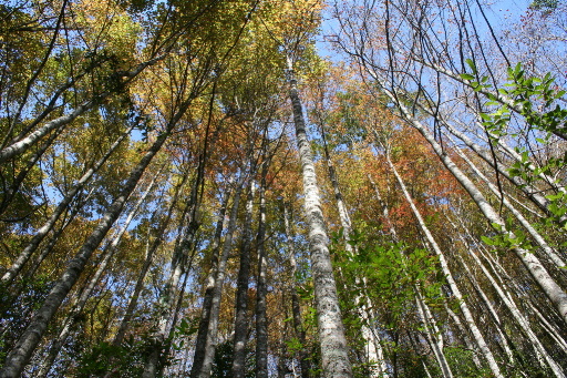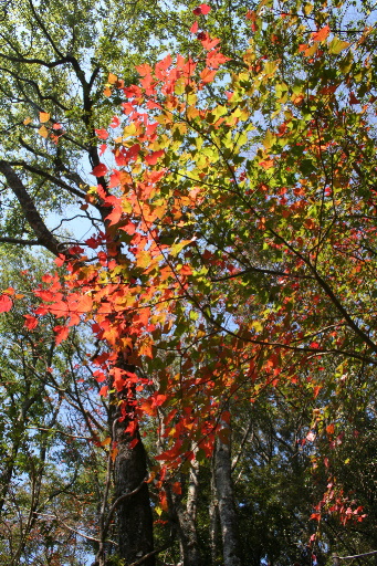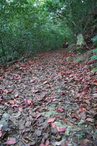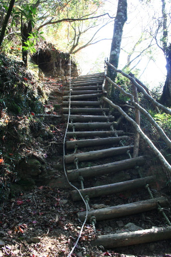 續行。稍後即來段陡下杉木梯,也是小段而已。沿途仍不時有紅黃色的紅榨槭出現。 |
