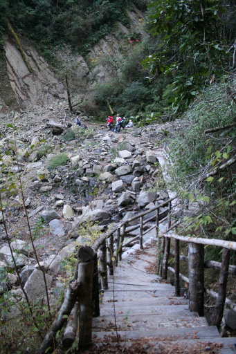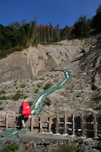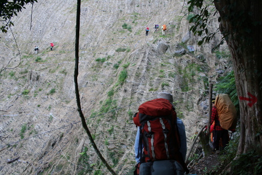 08:05 第一處大崩塌地,攀繩陡上,有些危險。 |