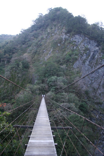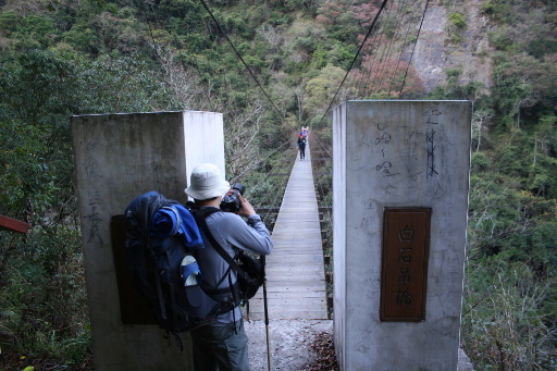 白石吊橋,建於大正十年,吊橋長達145公尺,真是又高又長,走起來有些恐怖,懼高者難過。下方溪邊有人紮營。H1318m |