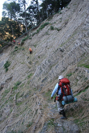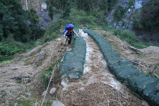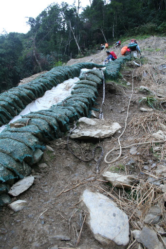 大崩塌地,已做好水土保持工程,新路直接沿著陡峭的坡面攀繩而上,有些危險。H1313m |