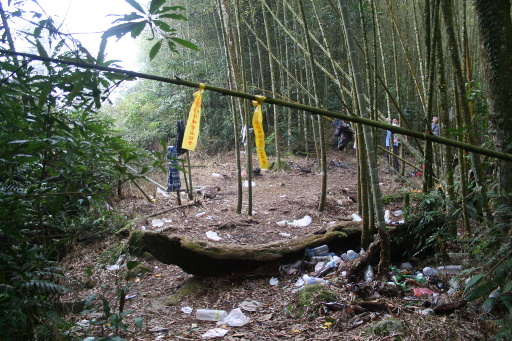 鞍部空地,非常髒亂,叉路,左下有條明顯山路,可通往九族文化村附近的產道,路途較短,但路況較差些,入口無路條。續行仍舊是大片的孟宗竹林,剛開始坡度平緩,但稍後越來越陡。H1265m |