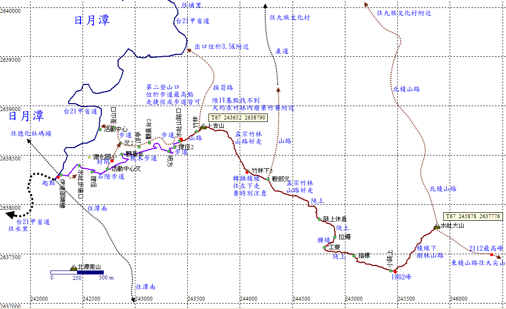 水社大山,2058m,二等三角點No.1134。日月潭四兄妹之首,初版台灣小百岳把它選入,但可能因為難度太高,二版已改由同是日月潭四兄妹的貓蘭山遞補。有舊標示牌標高2120m,其實是東方的最高峰處。另有標示牌寫著「前峰」,也是相對於2120m最高峰而言的。山頂無展望。基石處續行為北稜山路,可下往九族文化村附近。H2068m |