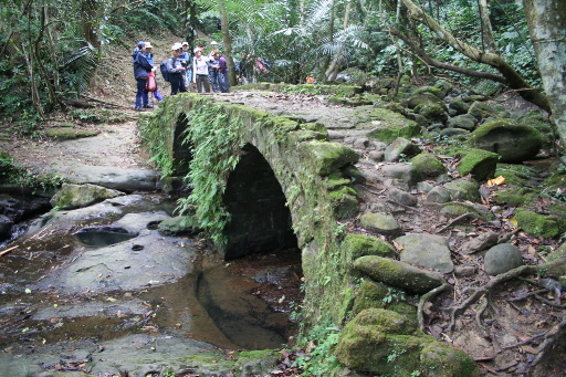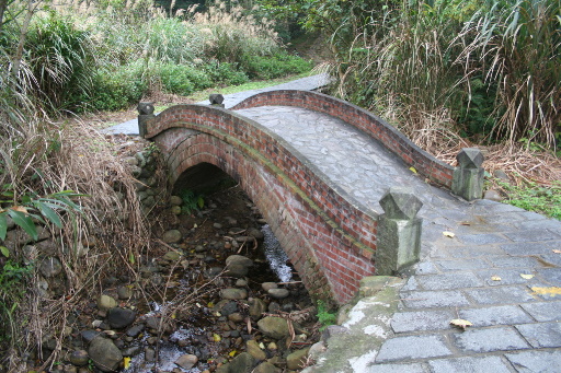 濟安橋,距離太平橋數十公尺而已,難怪共用一碑。橋下為極小溪流。橋身嬌小,但比太平橋美妙許多。續行數十公尺後,水泥路終,轉為圓石步道往上,開始古意盎然的打鐵寮古道。稍後轉為森林泥土小徑,坡緩路寬,相當好走。偶而路狹或過山溝處,都架設有枕木橋。H192m |