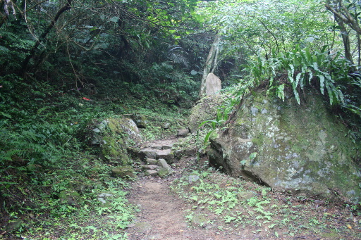 巨石下石棚土地公,位於古道左側,距離小木橋約30公尺。此段雖陡,但是古老石階別具風味。H267m |