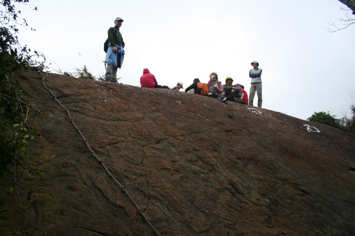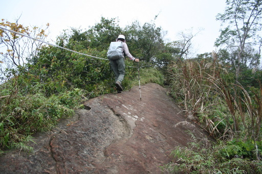 續行,取左攀繩陡下,繞白石山腳路線回。山路隨即轉為白石山稜線巨岩底下的山路,還算好走。仰望白色斑駁巨岩,綿延數百公尺,白石山之名肇因於此。 |