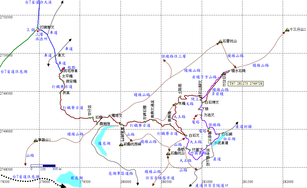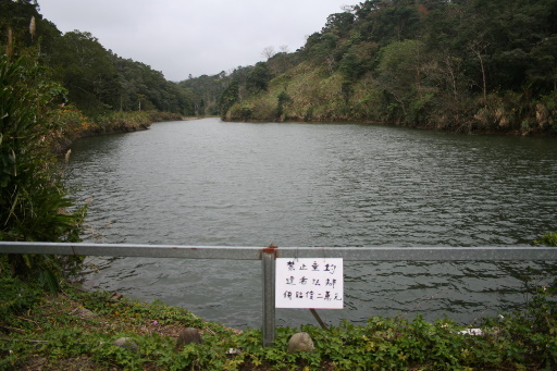 白石湖畔登山口,湖畔車道左側封閉,右側可出百吉隧道口。白石湖又稱白石埤,湖區狹長,沒有特別開發為風景區。續行取右。H408m |