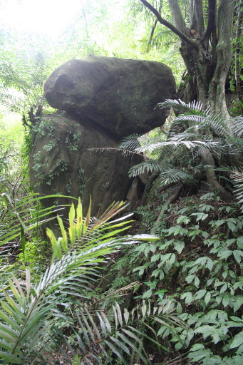 叉路,左下往白石山腳,往樟樹區35分;直行往金面山石壁腳,來路往白石山5分鐘。此路口有個奇岩,像是大一號的皇帝椅(小號的在平溪石筍尖上),可惜積水有點髒。休息午餐。H611m |