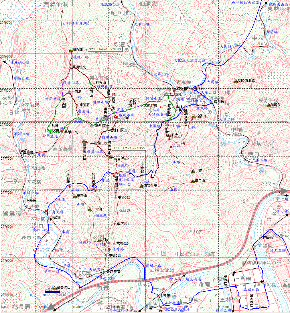 搭基隆市公車402堵南里線至終點站,往前過千祥橋就是五堵交流道,與車隊會合。集合完畢後出發循華新一路往友蚋,過有諒橋後數十公尺右轉往瑪陵方向。H35m |
