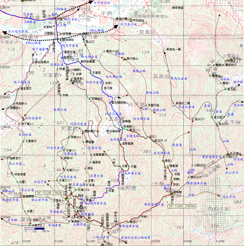 回到竹園模特兒叉路,續行古道往天南宮,稍後即進入雜木林,路況仍佳。H312m |