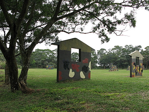 續行,稜線變得寬平,有兩條平行的路可往蓮華山,左下沿稜線邊走的小徑為飛龍步道,右側寬平的大土路為軍事訓練場道路,由於沒有標示,我們選大道而行,沿途有很多軍事訓練設施,大部分已廢棄,但頗為有趣。 |