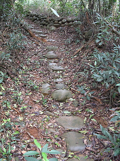 接上水泥產道,旁邊設有木椅,十字路口,左循產道往三聖宮、飛龍步道,右循產道往飛龍池,直下為載熙古道往飛龍池。來路標示為飛龍步道,但這條山路比較荒涼,也容易誤入軍事教練場。載熙古道一路大卵石階梯陡下,雨後濕滑,小心通行。H219m |