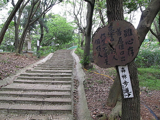 貴山公園入口,左側為貴山街口,進入公園。石階步道一路往上。中途有好幾條繞行山腰的土路步道,還有幾座石雕作品陳列。H185m |