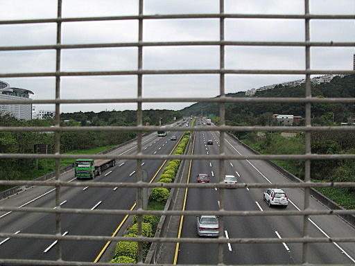 貴山街、環東路口,右轉環東路,不久遇校前路,左轉往山區。中途會經過中山高楊梅收費站附近,隔著圍欄俯瞰車流。H195m |