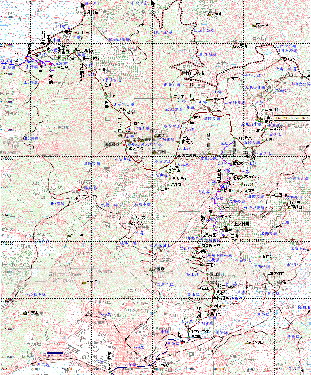 步道叉路,接上中正山往竹子湖的步道主線,取右往中正山觀景樓0.1Km。H659m |