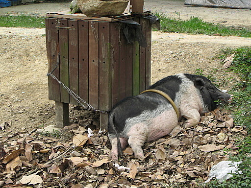 南寮福德宮,上回看到的可愛小豬居然還在,儼然變成觀光景點。續行,偏右進入往上的水泥路,立刻轉為步道,途經烤肉場,步道之字形陡上。H91m |