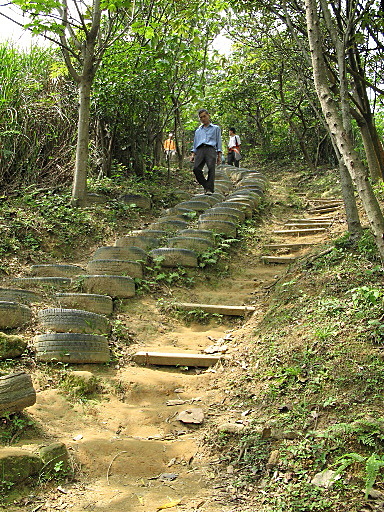 南寮福德宮大土地公像,路右即是大同山登山步道口。眺望大同山。取右往上,步道口標示為青龍嶺登山步道。步道一路往上,大部分為枕木或簡易木梯。上稜後轉為土路步道。中途有些木椅可休息。H127m |
