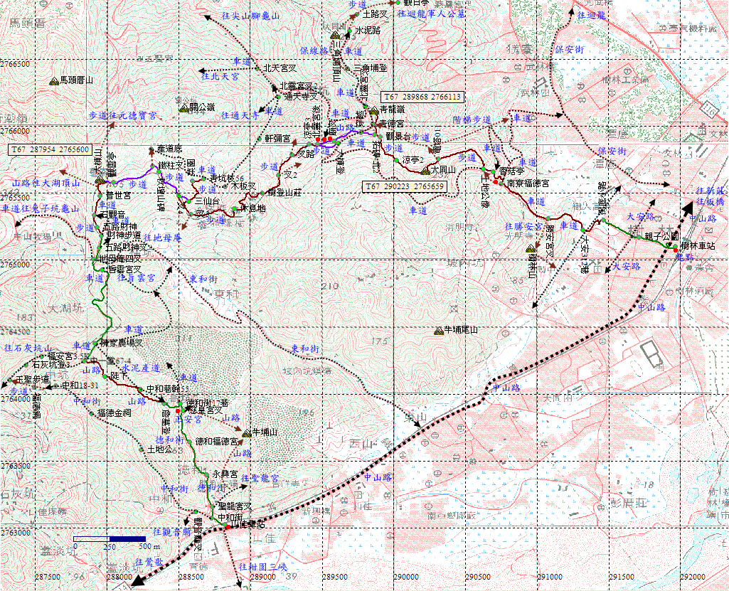 樹林火車站,中山路出口,出發,穿越中山路,略偏左進入樹德街,中途經過長壽親子公園,直行到底。H21m |