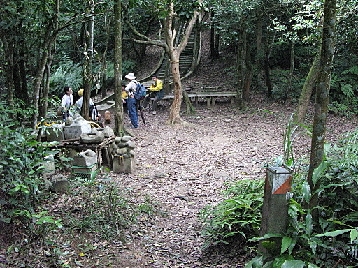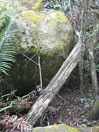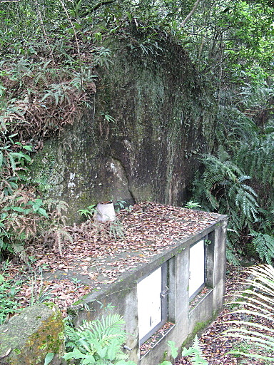郭媽墓。稍後有小水源,可能是先前經過的那條迷你小溪的上源。溪畔岩石下有個奇怪的水泥箱。此山區經常有巨石出現在樹林內,也算是一種特殊風景。接近電塔時山路轉陡,最後居然出現水泥階梯與鐵欄杆。H228m |
