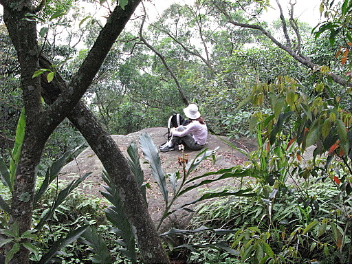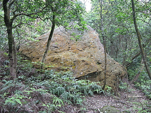 平頂巨岩,位於路左,是極佳的休息地,休息。休息時研究一下附近的巨岩。最後在平頂巨岩的另一側,發現有人為路徑可登頂其中一塊巨岩。需要踩踏已有些年代的木條,小心翼翼。H330m |