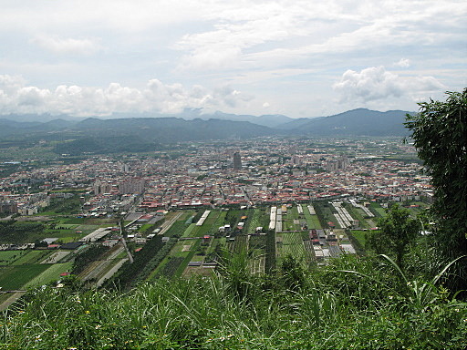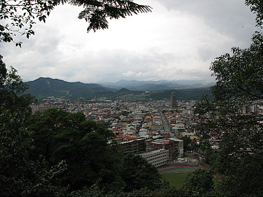 虎子山,556m,又稱虎頭山。台灣測量原點,可惜一等三角點已不見,山頂立有四根石柱。通往山頂涼亭的角落發現一座日據時代遺留下來的短柱,「日月潭水...記念 昭和八年十一月二十日」。旁邊還有聯勤測量內導593基石。涼亭處展望極佳,俯瞰埔里,盆地外圍最顯眼的好像是西南側的白葉山。稍後又在登頂步道旁的「環抱翠綠」大石附近發現另一顆內導598基石。遠眺埔里郊區金碧輝煌的中台禪寺。遠眺埔里鎮最高的地標建築,普天精舍,中台禪寺財力之雄厚可見一斑。午休時間下一場消暑雨也是不錯。H566m |