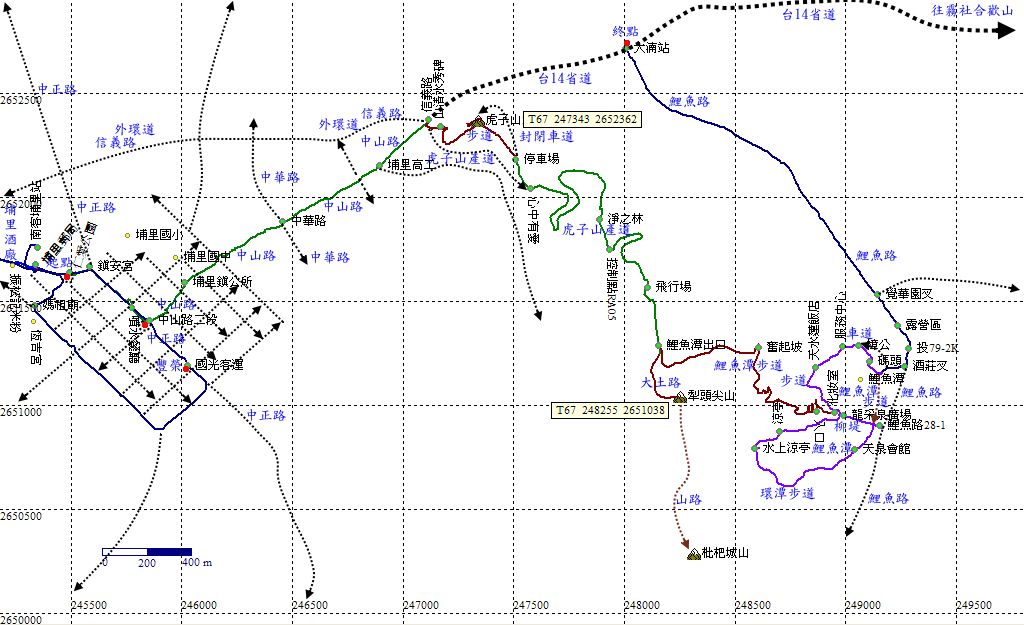 台灣地理中心碑步道口,位於中山路、信義路口,有些攤販。循寬大的步道往台灣地理中心碑、虎子山,右側另有車道可繞上山頂。H489m |