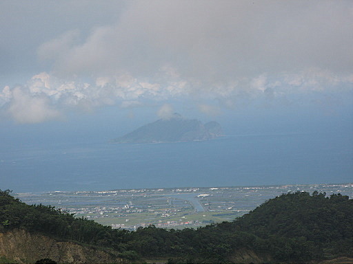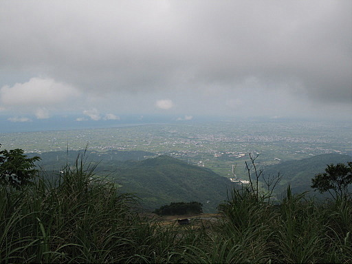 產道叉路,接上較大一點點的產道,但仍崎嶇,取左往下。此處有根木桿標示往烘爐地山。不久發現帽子掉了,回頭找尋,浪費五分鐘。產道上展望越來越讚,俯瞰蘭陽平原。H892m |