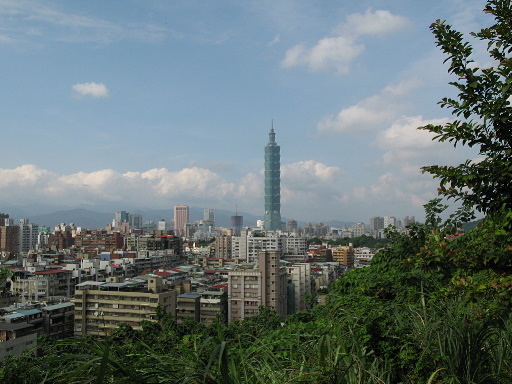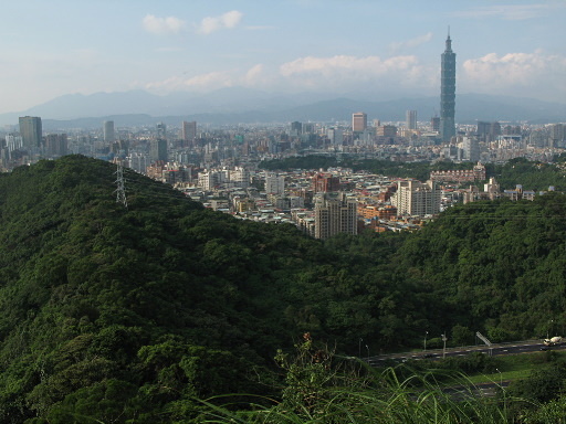 福州山,約100m,無基石。由於此山無基石,哪裡算是山頂莫衷一是,這個樹林間的休憩區大約是此山的最高點,設有「福州山公園」大標示,最高處為觀景台,展望極佳。眺望台北101。H102m |