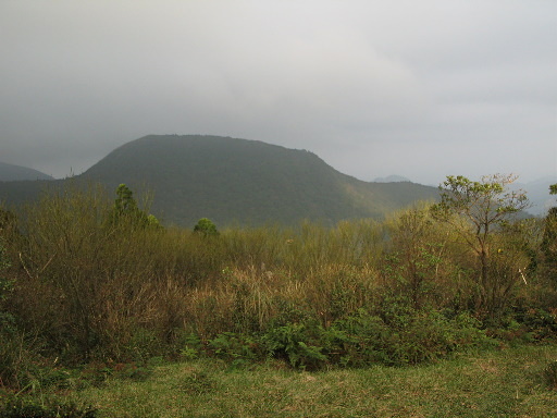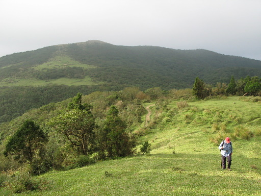 續行,循稜線草原往遠離大尖山方向。沿途有防迷地線,雲霧籠罩時草原地帶很容易讓人迷路,因此有此安全措施。回望大尖山。 |
