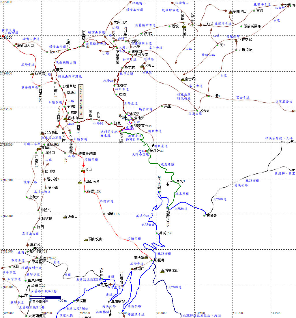 杏林山,790m,北市地測精幹點「市208」。山頂是個小草地,基石就在中央,無標示牌。山頂是個叉路,左往瑞泉,右往頂山、高頂山。H807m |