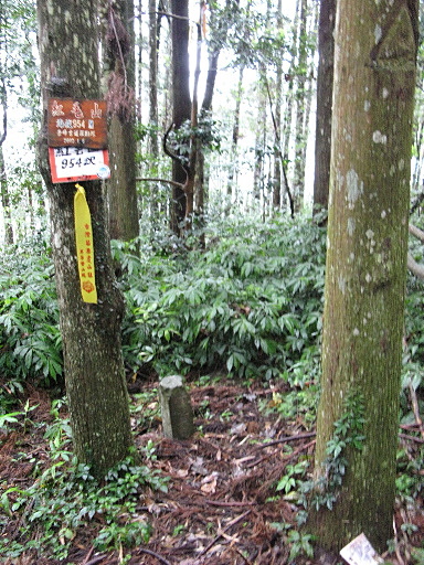 紅毛山,954m,殖產局樟林地界第二九號基石,大正十四年八月建設。基石處不在最高點,偏右下方,杉木林間無展望。H964m |