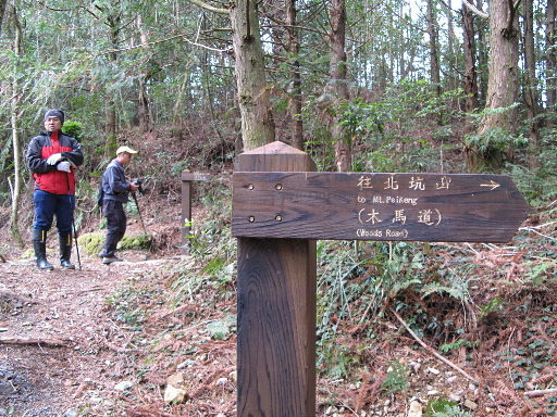 北坑山登山口,位於林道叉路口,初估約29.8K處(林道後段無里程標示),路口的標示並不明顯。左側的較小林道進入後才看到指標,木馬道往北坑山,其左側另有登山步道往北坑山。H2012m |