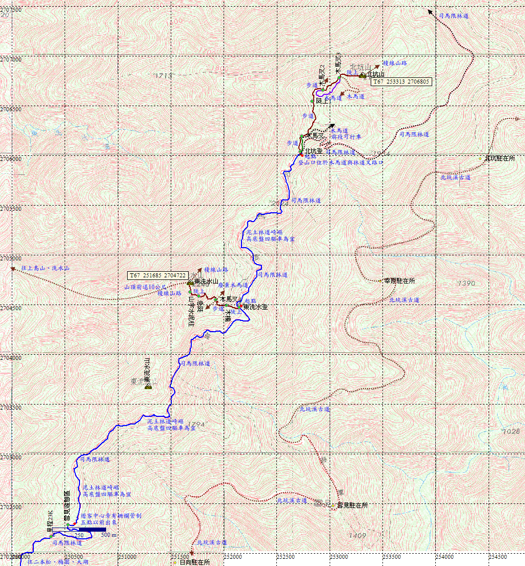 回到北坑山登山口,午餐。餐後循林道退回。H2012m |