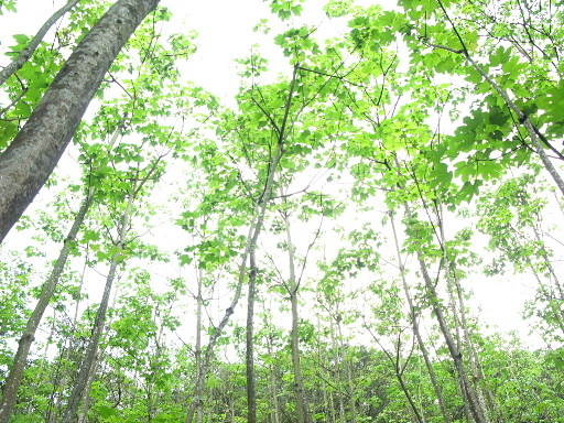 油桐林,沒有我預期的花況,只有零星開花,或許是這一群油桐樹年紀都還很輕,過幾年再來瞧瞧。樹林內山路雜草叢生,並不明顯,一路跟著稀疏的路條往上。這處油桐林幾乎延伸到稜線下方,算是頗大片的了。H116m |